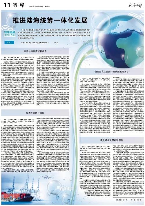 近日,《经济日报》特邀四位专家,对“如何着力推进陆海统筹,切实以海洋经济高质量发展助力海洋强国建设”等问题进行深入探讨。其中,海洋发展研究院研究员、管理学院高乐华老师受邀接受采访。高乐华研究员分析了海洋资源开发两极分化的原因,并就“如何根据陆海资源环境承载能力和发展潜力,合理开发布局”提出了四点建议,认为当前还需加紧技术研发、推进平台建设、引导产业耦合、实行联动管理,合理保护与开发海洋资源,积极应对我国陆地资源日益短缺、缓解经济发展资源的瓶颈。