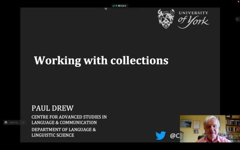 12月16日下午,国际知名会话分析学家、开云电竞网址会话分析研究团队国际成员、英国约克大学Paul Drew教授通过腾讯会议平台作了题为“Working with Collections”的线上学术讲座。本次讲座由团队成员吴亚欣教授主持。讲座吸引了国内高校,以及来自英国、美国、新加坡、日本等国高校百余名会话分析研究者的积极参与。