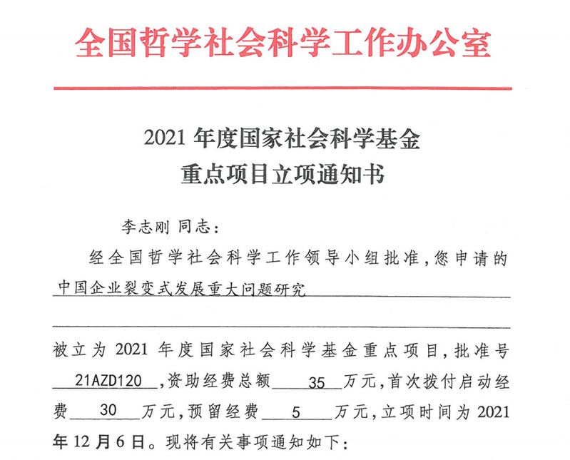 日前,接全国哲学社会科学工作办公室通知,管理学院博士生导师李志刚教授牵头申报的“中国企业裂变式发展重大问题研究”项目(批准号:21AZD120)获批国家社科基金“重大转重点”项目。裂变式发展是以裂变创业为主要实践形式,通过搭建创新创业平台、赋能新组织裂变、发展产品生态链等方式,以激发内生动力,落实创新驱动为目的的高质量战略发展模式。李志刚教授团队长期从事裂变创业研究,熟悉前沿理论,关注创新创业实践,立足于创新驱动发展战略和高质量发展战略等国家重大战略需求,并结合近20年团队研究积累,颇具洞察力和创新性地提出了“中国企业裂变式发展重大问题研究”这一国家社科基金重大项目选题,并成功获批国家社科基金“重大转重点”项目。