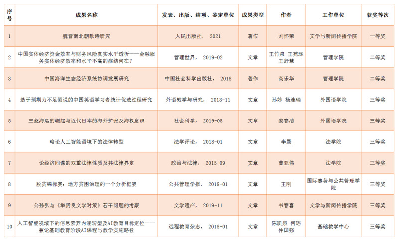 日前,山东省第三十五届社会科学优秀成果奖和第十五届社会科学突出贡献奖获奖名单揭晓。学校共有10项成果获得山东省第三十五届社会科学优秀成果奖,其中,一等奖1项,二等奖2项,三等奖7项。文学与新闻传播学院刘怀荣教授的著作《魏晋南北朝歌诗研究》荣获一等奖,该成果曾入选“2019年国家哲学社会科学成果文库”。管理学院曹洪军教授荣获山东省第十五届社会科学突出贡献奖,这是学校教师首次获得该奖励。
