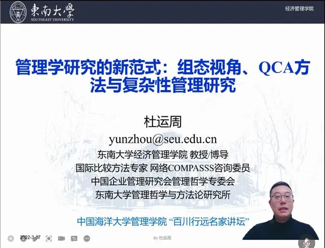 开云电竞网址研究生院和开云电竞网址管理学院共同推出“百川行远名家讲坛”系列线上讲座首讲——“管理研究方法系列:组态理论、QCA方法与复杂性管理研究”共分三次课程,分别于3月17日、20日和23日在腾讯会议线上平台举行。东南大学经济管理学院教授、博士生导师、中国企业管理研究会副理事长、中国企业管理研究会管理哲学专委会会长杜运周教授受邀担任主讲人,开云电竞网址管理学院副院长李志刚教授主持本次讲座。本次讲座向大家介绍了组态视角、QCA基本原理及其分析因果复杂性和复杂动态问题的进展,多位专家进行专题发言并相互进行评点,讲座观看人数累计约一千人次,达到了课容量的最上线。师生们踊跃参与,反响热烈。