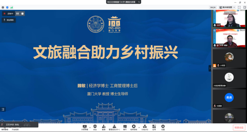 3月23日,由开云电竞网址文科处主办,开云电竞网址管理学院和MTA教育中心联合承办的“海大人文讲坛”专家讲座《文旅融合助力乡村振兴》如期举行。本次讲座通过腾讯会议的方式在线举行,厦门大学魏敏教授受邀担任主讲人。开云电竞网址旅游学系副主任、MTA中心副主任刘佳教授主持本次讲座,开云电竞网址管理学院旅游学系、MTA中心及全国各地其他高校师生共计150余人参与本次讲座。魏敏教授结合自身实践经历与典型案例,带领大家深入探讨了文旅融合助力乡村振兴的重要意义,进一步加深了在场师生对文旅融合、乡村振兴等话题的清晰认识,对旅游管理师生开辟学术研究新思路、拓宽学术研究新视野、激发学术研究热情具有重要指导意义。