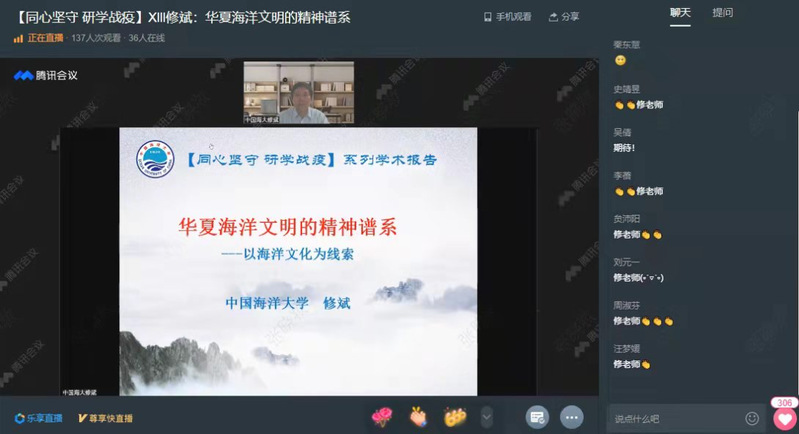 3月26日,“同心坚守研学战疫”系列学术报告第XIII场在开云电竞app安卓版下载安装企业微信乐享小直播开讲。开云电竞网址文学与新闻传播学院院长、行远书院执行院长修斌教授受邀主讲“华夏海洋文明的精神谱系”,观看点赞达5000余人次。修斌以海洋命运共同体为背景,介绍了华夏文明的起源与海洋的关系。华夏海洋文明是华夏文明之一翼,各历史时期都有其鲜明的海洋文化特色,以海域文化交流为核心的海洋文化交流,能使中国海洋文化和华夏海洋文明得以生生不息。在构建海洋命运共同体进程中,中国与世界将更好地推动文明的交流互鉴。修斌教授的学术报告贯通古今、条分缕析,聆听报告的师生不仅收获了华夏海洋知识,领略了华夏海洋文明,也进一步做到了增强文化自觉,坚定文化自信。