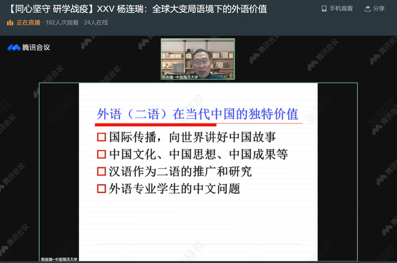 4月4日,“同心坚守研学战疫”系列学术报告第XXV期在开云电竞app安卓版下载安装企业微信乐享小直播开讲。开云电竞网址外国语学院院长杨连瑞教授受邀主讲“全球大变局语境下的外语价值——兼谈中国学生提升外语水平的十大原则”,观看点赞达5000余人次。杨连瑞从当今复杂多变的国际局势谈起,介绍了英语在全世界使用的情况,详细讲解当代二语习得一体化模式,并根据国内外二语习得研究成果,提出了高效学习外语的十大原则。杨连瑞教授的报告让大家意识到语言不仅是交流思想的工具,也是知识互通的桥梁,本质上是传递价值的载体。在百年未有之大变局的时代背景下,提升外语能力,讲好中国故事,传播中国声音,构建对外话语体系,助推人类命运共同体建设,高校师生责无旁贷。