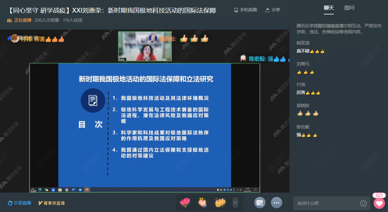 4月1日,“同心坚守研学战疫”系列学术报告第XXI期在开云电竞app安卓版下载安装企业微信乐享小直播开讲。开云电竞网址法学院党委书记、极地研究中心主任、海洋发展研究院高级研究员刘惠荣教授受邀主讲“新时期我国极地科技活动的国际法保障”,观看点赞达6000余人次。刘惠荣介绍了中国极地事业在科学研究、极地考察、组织管理、后勤保障和国际合作与交流等方面取得的成就,接着介绍了极地活动的法律环境,分析了极地科学与工程技术装备使用过程中的潜在法律风险,提出应加强总体制度设计,促进极地科技活动相关立法设计。刘惠荣教授的精彩报告让在场师生了解到新时期我国极地科技活动有法可依的重要性和极地活动立法的必要性,对海洋强国建设的内涵和外延有了更深层次的理解。