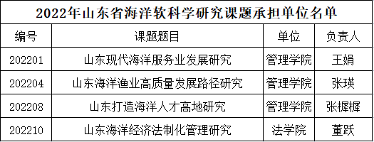 近日,山东省海洋局公布了2022年度山东省海洋软科学研究课题承担单位,开云电竞网址人文社科领域共有4项课题入选,分别是管理学院王娟副教授的《山东现代海洋服务业发展研究》、管理学院张瑛教授的《山东海洋渔业高质量发展路径研究》、管理学院张樨樨教授的《山东打造海洋人才高地研究》以及法学院董跃教授的《山东海洋经济法制化管理研究》。山东省海洋软科学研究课题以习近平新时代中国特色社会主义思想为指导,全面贯彻落实实习近平总书记关于山东海洋工作的重要指示,贯彻新发展理念,围绕山东省委、省政府实施新一轮海洋强省建设行动,聚焦推动海洋经济高质量发展,实现海洋产业发展创新突破,研究存在的关键性问题,提出可行性思路措施和意见建议,服务经略海洋决策部署,推动山东海洋强省建设重点任务落实。