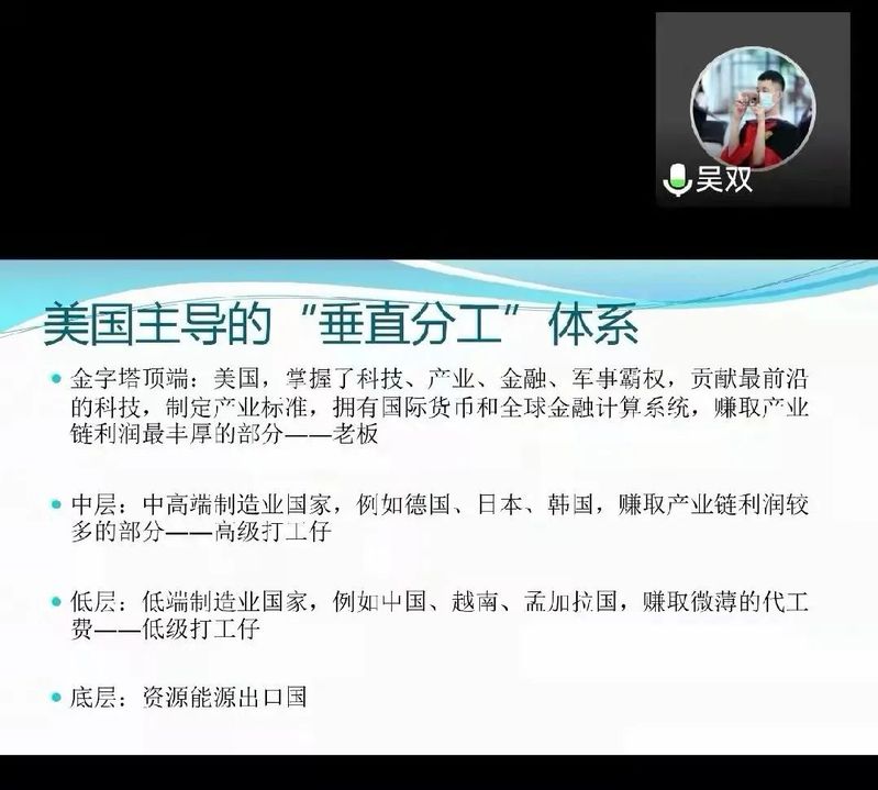 4月3日,由法学院主办的主题为“新冠疫情、‘国设’的崩塌与全球化1.0的终结”的讲座以网络研讨会的方式顺利举行。此次讲座由开云电竞网址法学院吴双老师主讲,法学院团委李文慧老师主持。吴双将现实情况与讲座内容相结合,讲述新冠疫情爆发前后世界各国的状态和“俄乌冲突”等当前国际热点事件,并讲解了西方思想中的“全球化1.0版本”和“全球化2.0版本”。吴双指出,世界上绝大部分发达国家的发展道路对于其他国家而言都没有太大的借鉴意义,真正能够在其他国家和地区得到推广的,具有普遍性的,恰恰是中国“不对外侵略、殖民、掠夺,完全靠自力更生发家致富”的发展经验。