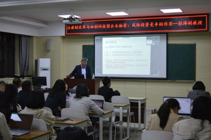 彭涛与参会师生分享了个人的研究经历,讲述了其研究方向的转变和研究内容的深化。彭涛从聚焦风险投资与企业创新创业领域所获得的一些研究成果讲起,结合政府政策在风险投资与企业创新创业中的作用,着重探讨了注册制改革对初创科技企业股权融资影响的原因和意义。