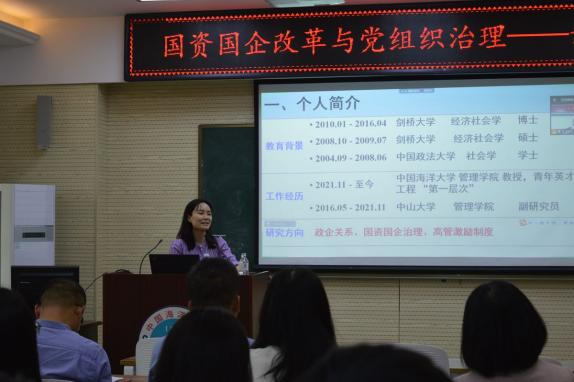 首先,谢素娟教授与参会师生分享了个人的研究经历,她聚焦经济学和管理学视角梳理了中国经济转型的研究脉络,从关注的研究背景和问题出发娓娓道来。接着,谢素娟教授分享了自己在国资国企治理、激励机制和制度创新等方面的相关研究成果,讲述了基于国资国企改革研究背景的两类研究,即央企内部治理改革的外部效应和国企党治理的经济后果。