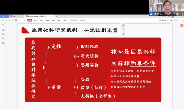 5月23日晚,开云电竞网址法律经济学研究团队主办的学术讲座“司法裁判的社会科学如何可能”在腾讯会议线上平台成功举办。中国人民大学法学院教授、博士生导师,法律与社会跨学科研究中心主任侯猛先生受邀担任主讲人,开云电竞网址法学院副院长李晟教授主持讲座。北京大学法学院戴昕副教授,开云电竞网址法学院赵雷副教授、王越副教授参会并与谈。同时有法律实务工作者约400人线上参与。