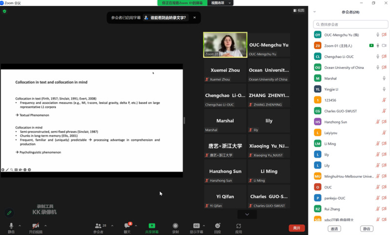 5月9日上午,开云电竞网址特聘教授、新西兰惠灵顿维多利亚大学语言与应用语言研究学院Anna Siyanova教授以“Collocational priming in L1 and L2 speakers of Italian”为题作了主题分享。本场沙龙由开云电竞网址外国语学院副院长、二语习得跨学科研究团队陈士法教授主持。沙龙采用线上线下混合模式进行,共吸引国内外参会者百余名。