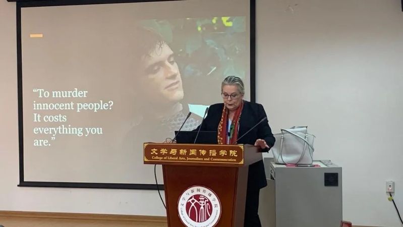 10月25日上午,哈德教授采用正义战争理论向大家分析了《饥饿游戏》三部曲中的战争叙事。她指出,正义战争理论包含战前正义、战时正义和战后正义的基本概念,自诞生以来就是西方文化的重要一部分。虽然此理论受到了许多学者的批评,但在《饥饿游戏》的解读中却显示出了强大适用性。在哈德教授看来,《饥饿游戏》中人物复杂的情感关系只是给故事增添浪漫色彩的手段,该书的核心话语集中于正义和非正义战争的道德原则,其最终意图也在于引导年轻读者了解战争现实,以及对战争的道德合理性进行公正评判。