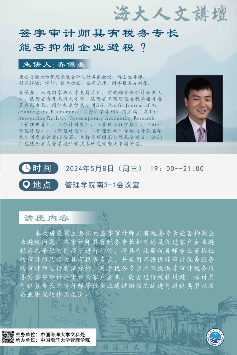 海大人文讲坛2024年第21讲-齐保垒 | 签字审计师具有税务专长能否抑制企业避税?