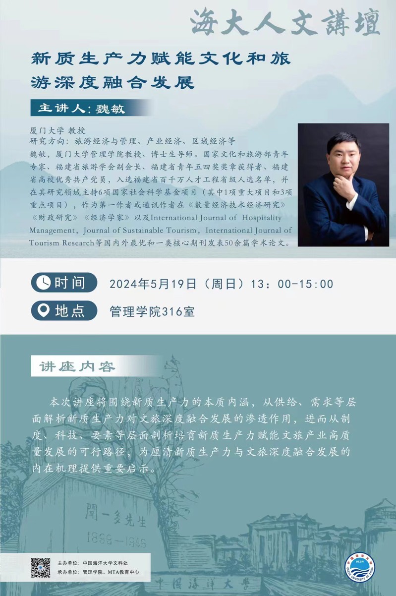 海大人文讲坛2024年第36讲-魏敏 | 新质生产力赋能文化和旅游深度融合发展
