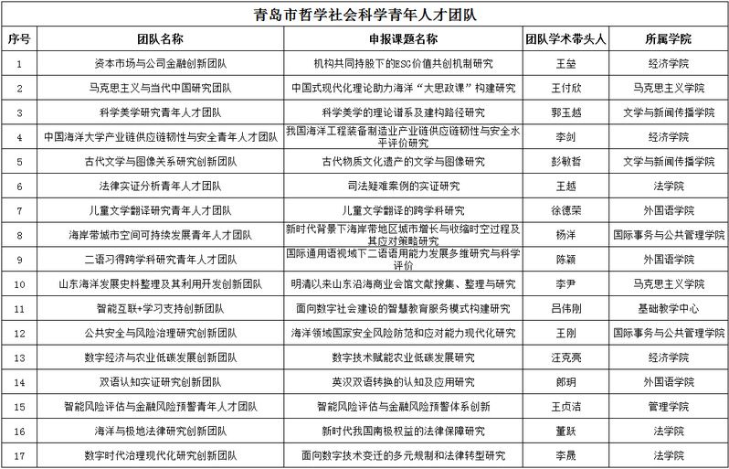 近日,青岛市社会科学界联合会公布了青岛市哲学社会科学青年人才团队名单,开云电竞网址共有17支团队入选,入选团队研究方向涵盖经济学、管理学、文学、法学、语言学、历史学、教育学、政治学等。