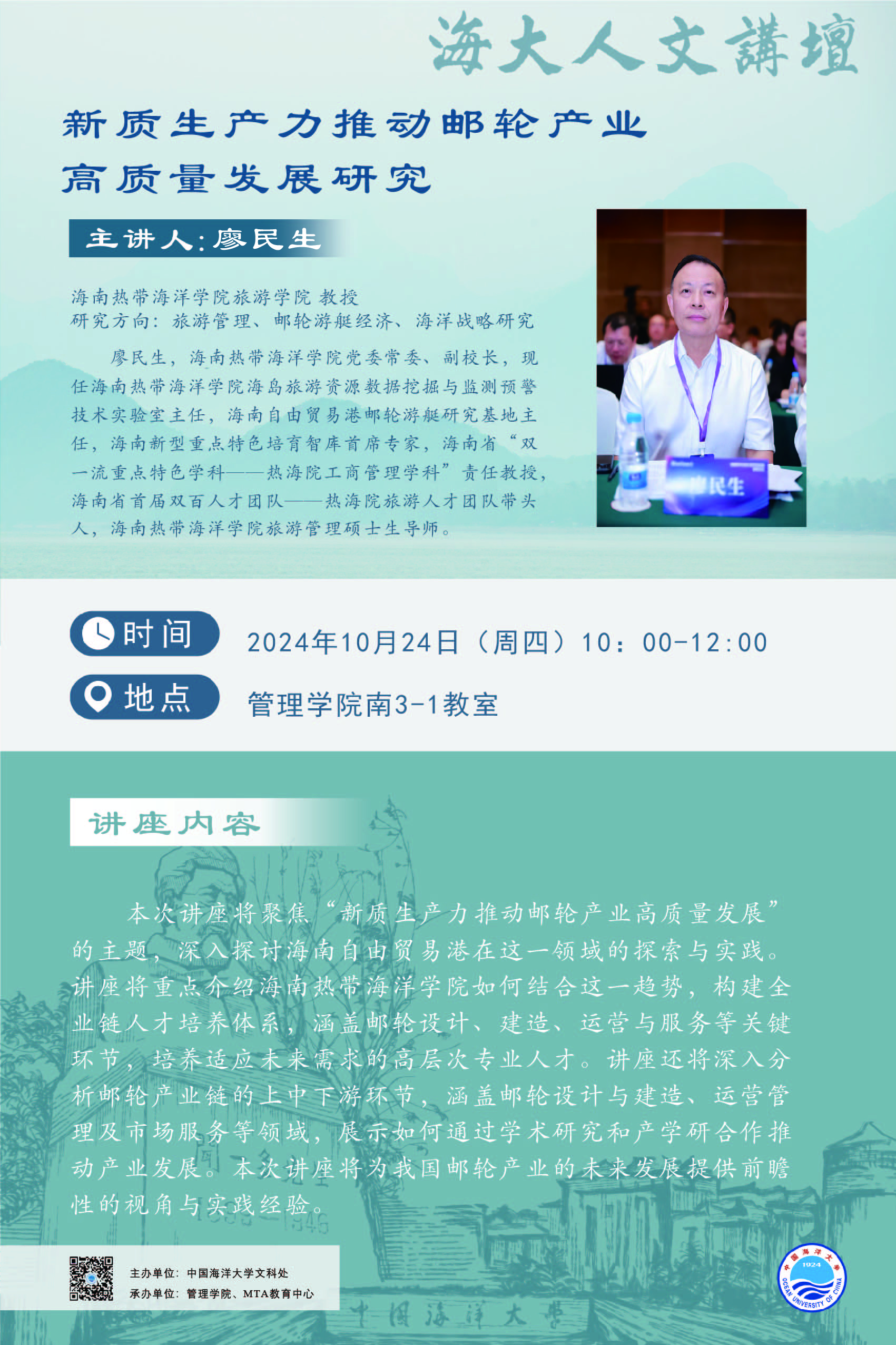 海大人文讲坛2024年第77讲-廖民生丨新质生产力推动邮轮产业高质量发展研究
