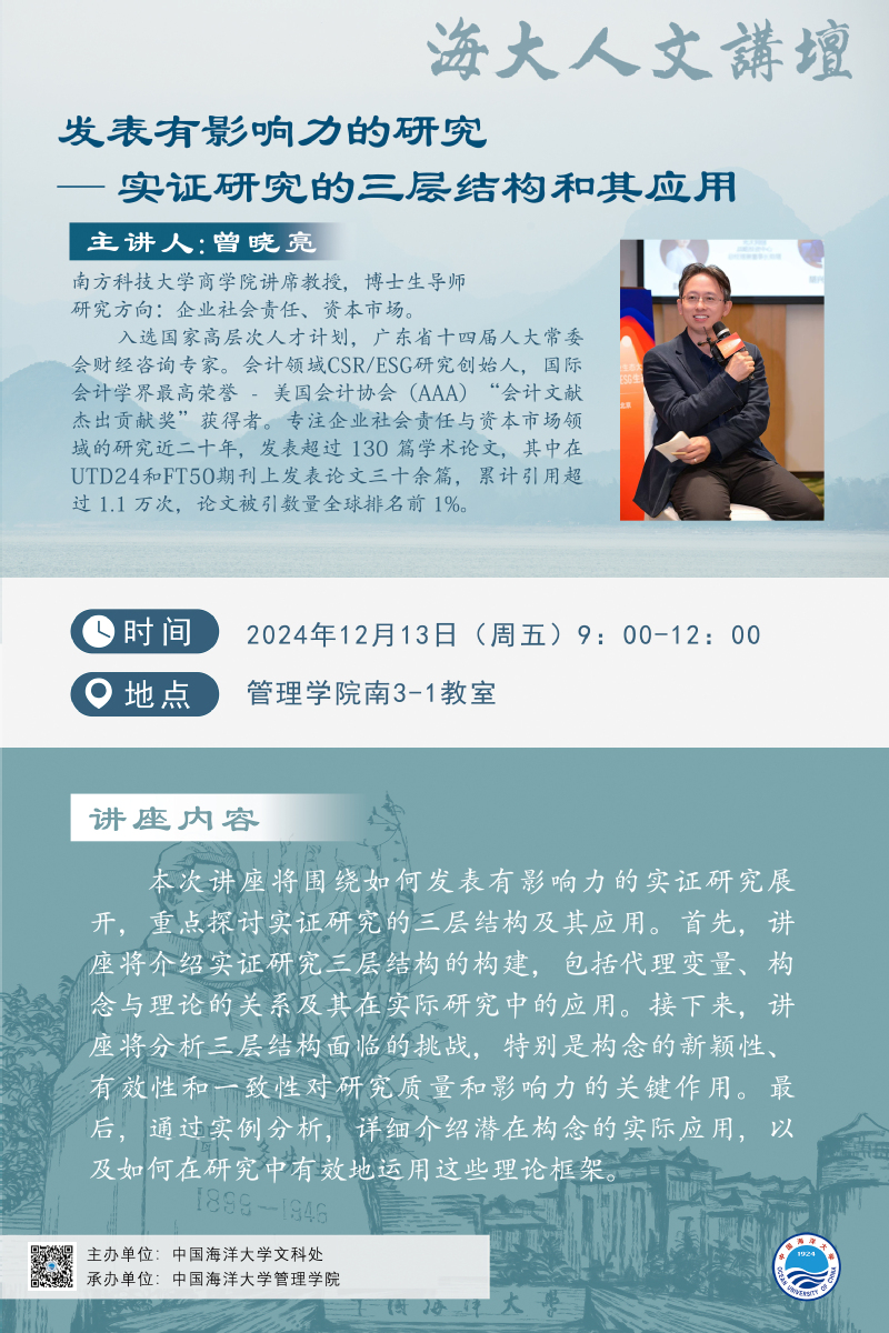 海大人文讲坛2024年第97讲-曾晓亮丨发表有影响力的研究—实证研究的三层结构和其应用