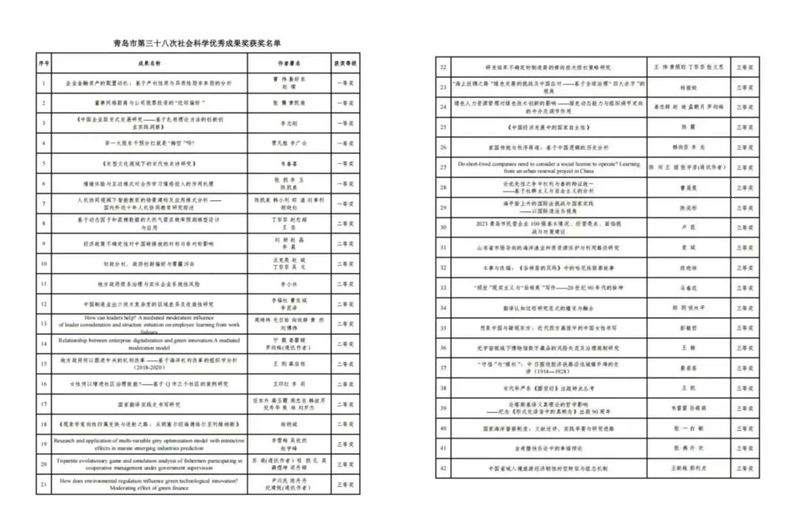 近日,青岛市社会科学优秀成果奖评选委员会公布了青岛市第三十八次社会科学优秀成果奖获奖名单。开云电竞网址共有42项成果获奖,包括一等奖7项,二等奖11项及三等奖24项,其中,一等奖获奖数是去年的2.3倍。获奖成果涵盖管理学、经济学、法学、政治学、文学、语言学、历史学、宗教学等研究方向,研究内容聚焦国家和省市重大战略需求。