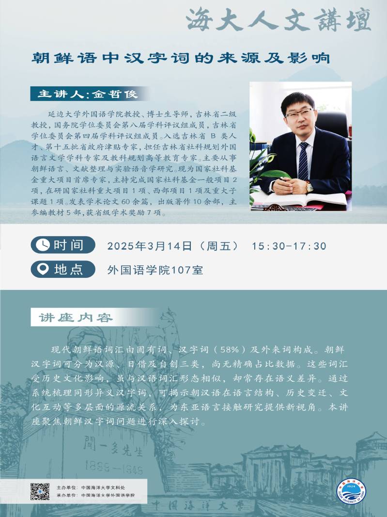 海大人文讲坛2025年第6讲-金哲俊丨朝鲜语中汉字词的来源及影响