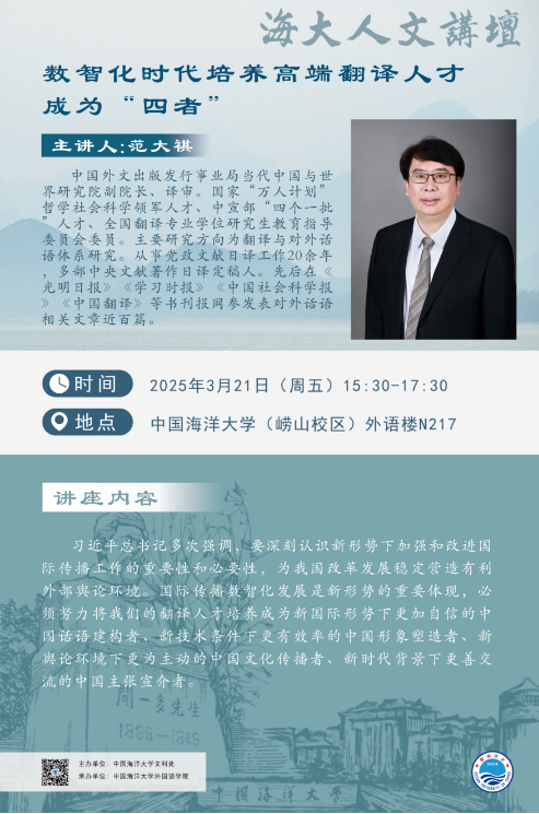 海大人文讲坛2025年第8讲-范大祺 | 数智化时代培养高端翻译人才成为“四者”