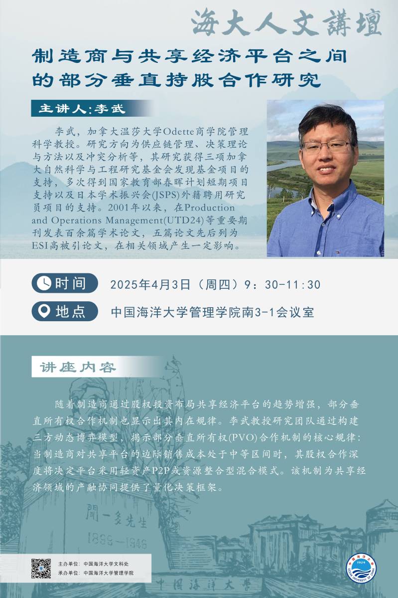 海大人文讲坛2025年第13讲-李武 | 制造商与共享经济平台之间的部分垂直持股合作研究