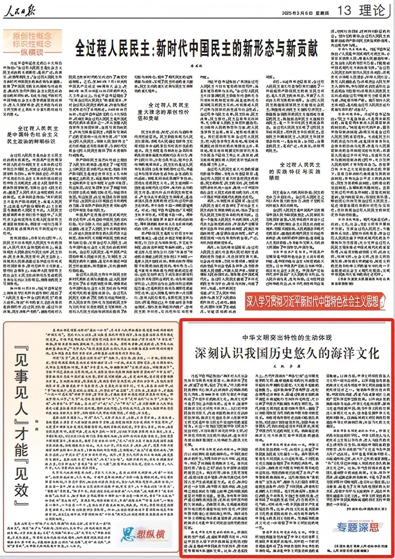 文章指出,伟大的中华民族拥有关心海洋、认识海洋、经略海洋的悠久传统,在5000多年文明发展史中积淀形成了多姿多彩的海洋文化。海洋文化并不是西方社会所独有的。近年来,随着中国海洋文化史研究不断深入,人们对中华民族历史悠久、内涵丰富的海洋文化认识更加深刻,海洋文化也成为深入理解中华文明尤其是中华文明五个突出特性的重要视角。从这一视角出发把握中华文明五个突出特性,不仅有助于深化对中华文明、对中华优秀传统文化的科学认识,也有利于为建设海洋强国注入精神动力、提供文化支撑。