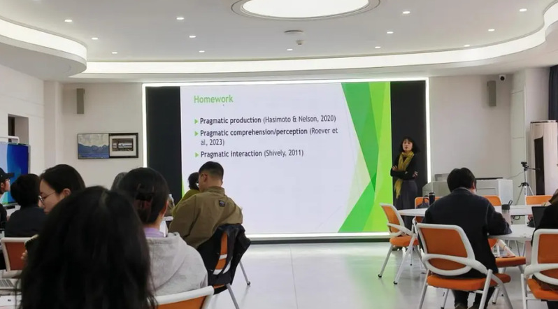 本次沙龙聚焦二语语用研究方法的理论与应用,分为两个部分。第一部分,Taguchi教授对二语语用研究方法的理论框架进行全面梳理,涵盖研究主题、分析单位及研究方法等三个关键层面。她将研究主题分为四个类别,分别是语用能力及其学习路径的探究、语用能力发展进程研究、学习者个体差异分析研究,以及语用学中的语境研究。在分析单位方面,Taguchi教授介绍了言语行为中的隐含义、程式语、互动能力、韵律等要素。就语用研究方法而言,Taguchi教授从语用产出、理解/感知和互动三个方面进行阐释,其中语用产出主要涉及语篇补全测试、封闭式角色扮演和真实对话录音等;语用理解/感知侧重于通过多项选择、量表式问卷、访谈及口头报告等方法进行评估;而语用互动则通过开放式角色扮演、会话分析、自然互动以及语料库语言学等方式研究实际互动中的语用。随后,Taguchi教授通过柱状图对目前二语语用研究中普遍采用的研究方法进行了直观呈现,详细剖析了语篇补全测试、多项选择以及访谈等常用语用研究方法的实际应用状况。结合实际语料数据,Taguchi教授对这些研究方法的数据编码与分析过程进行了深入阐释,并从客观角度评价了其优点与局限。