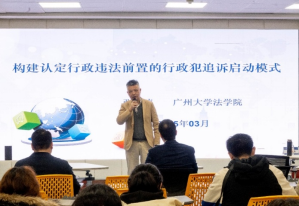 3月2日,广州大学法学院张泽涛教授应邀做客“海大人文讲坛”,在法学院一楼智慧教室做了题为“构建认定行政违法前置的行政犯追诉启动模式”讲座。本场讲座由法学院院长李晟教授主持,潘侠副教授、陈晓聪副教授、宋春龙副教授、张权老师、余鹏文老师等40余名师生参会。