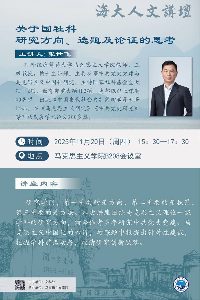 海大人文讲坛2025年第86讲—张世飞 | 关于国社科研究方向、选题及论证的思考