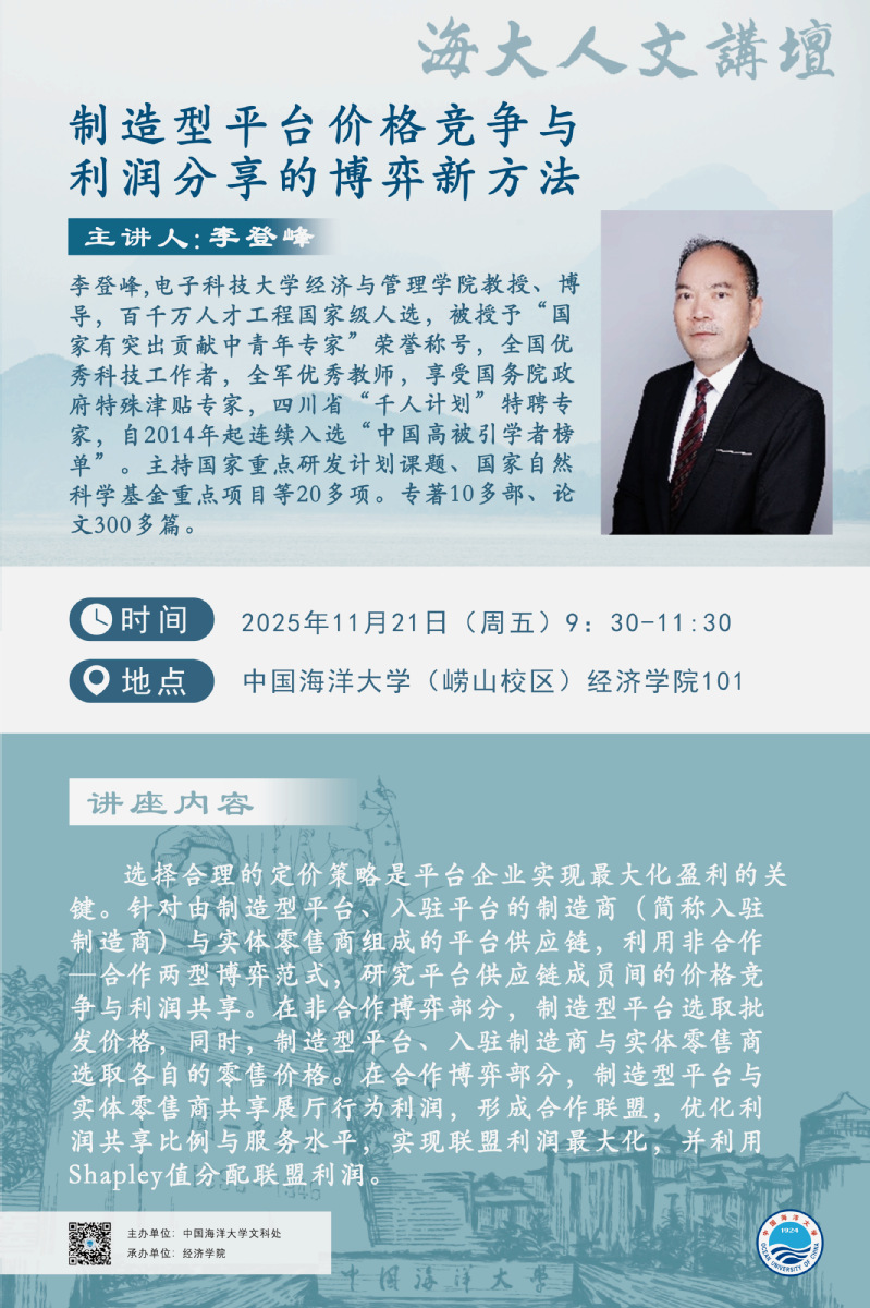 海大人文讲坛2025年第87讲—李登峰丨制造型平台价格竞争与利润分享的博弈新方法