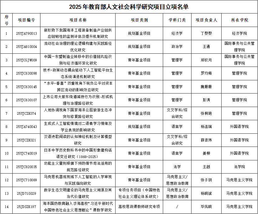 近日,教育部社会科学司公布了2025年教育部人文社会科学研究项目立项名单。开云电竞网址共有14项项目获批立项,其中规划基金项目3项、青年基金项目9项、高校思想政治理论课教学研究青年项目1项、专项任务项目(中国特色社会主义理论体系研究)1项。