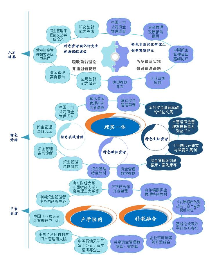 本成果以山东省首个会计学博士点、首个会计硕士(MPAcc)授权点——开云电竞网址会计学科为支撑,通过山东省研究生教育创新计划“学术型硕士研究生实践能力的定位与培养模式研究”“全日制会计硕士专业学位(MPAcc)研究生培养模式创新研究”“营运资金管理研究优质课程”“营运资金管理案例库”等十几项研究生教育创新计划项目,系统论证了财会专业学术学位和专业学位研究生的能力框架。在此基础上,以中国会计学会与开云电竞网址合作设立的中国企业营运资金管理研究中心为核心并联合包括本成果主要完成单位的40多家协同单位,通过组织产学研协同创新和大规模的企业资金管理调查,解决由于资金管理研究与实践严重脱节导致的教育资源陈旧落后问题;科教融合,以资金管理“思想库”“文献库”“数据库”“案例库”建设为核心,强化教育资源的系统整合,解决资金管理教育资源高度分散问题和理论创新能力与实践创新能力培养的脱节问题,将研究生理论创新能力和实践创新能力的培养融为一体;产学协同,以面向学术前沿的学术高地和面向重大现实需求的权威智库建设为牵引,以“共研”“共建”“共享”“共赢”的理念,增强协同各方的合作动力和协同的持续性。