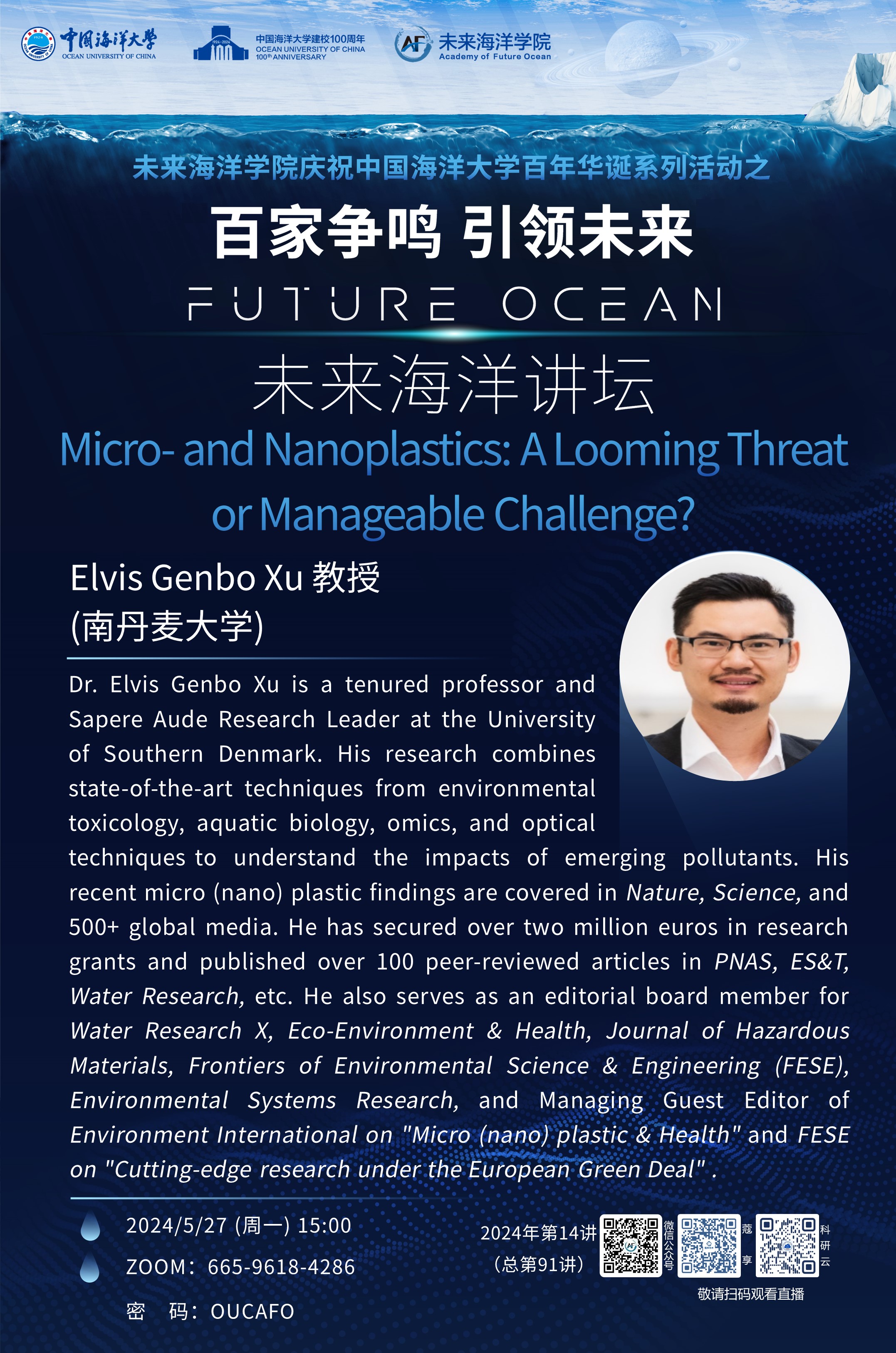 百家争鸣 引领未来丨未来海洋讲坛第91讲 (2024年第14讲) -Elvis Genbo Xu: Micro- and Nano plastics: A Looming Threat or Manageable Challenge?