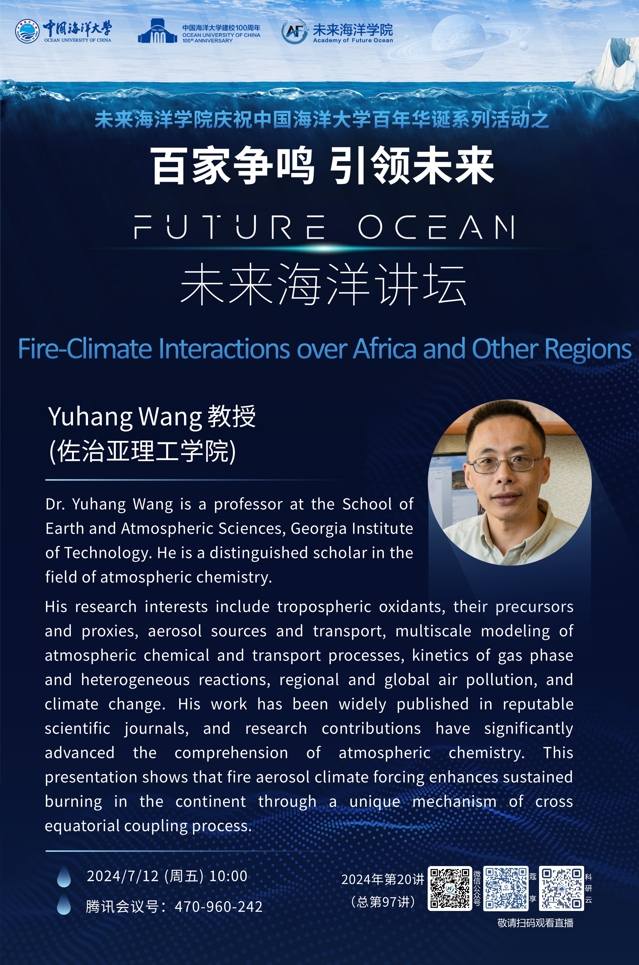 百家争鸣 引领未来 | 未来海洋讲坛第97讲(2024年第20讲) -Yuhang Wang: Fire-Climate Interactions over Africa and Other Regions