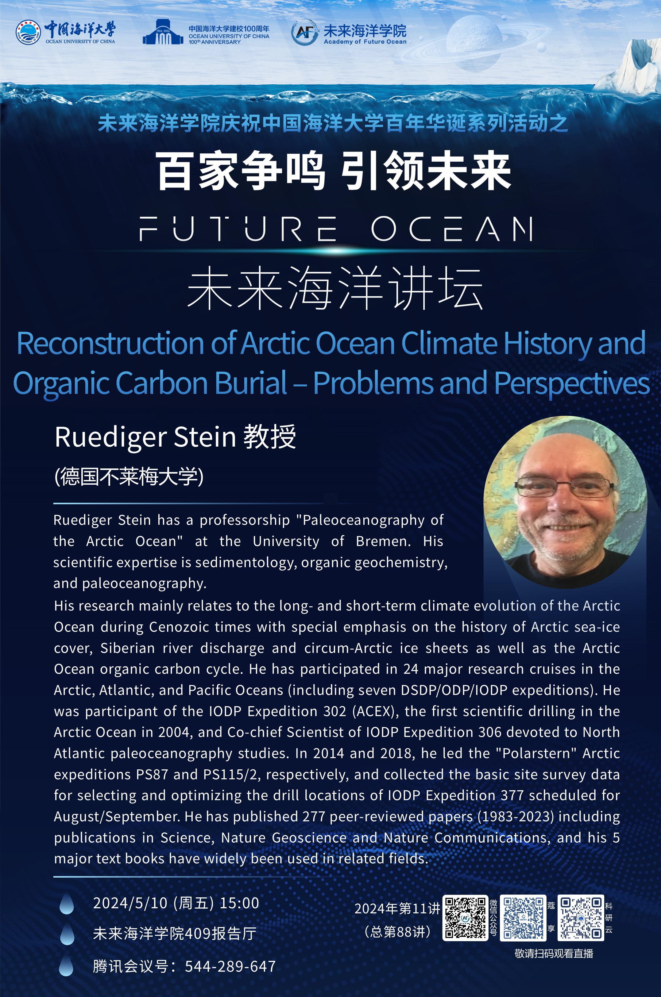 百家争鸣 引领未来丨未来海洋讲坛第88讲 (2024年第11讲) -Ruediger Stein: Reconstruction of Arctic Ocean Climate History and Organic Carbon Burial – Problems and Perspectives