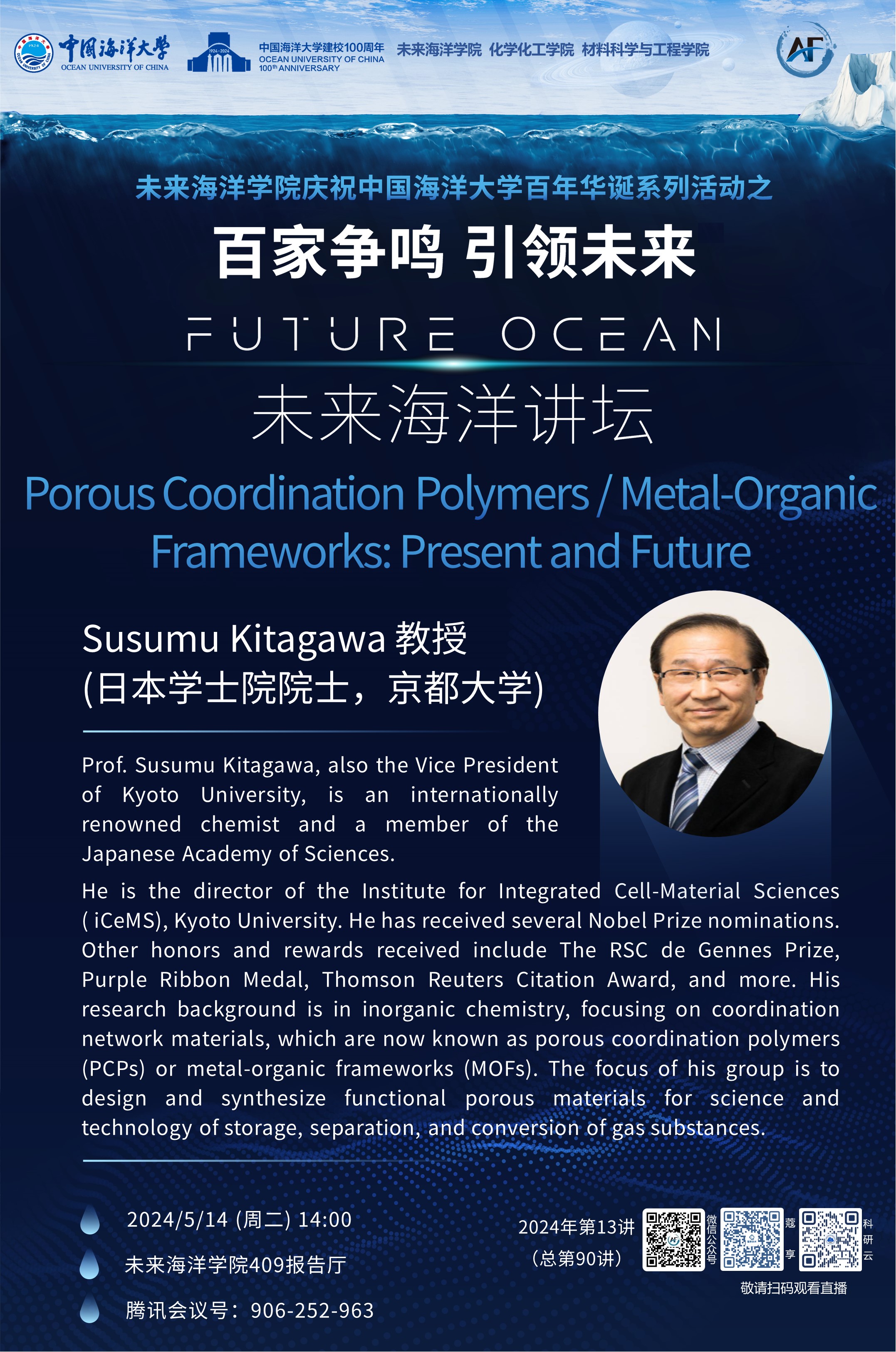 百家争鸣 引领未来丨未来海洋讲坛第90讲 (2024年第13讲) -Susumu Kitagawa: Porous Coordination Polymers/Metal-Organic Frameworks-Present and Future