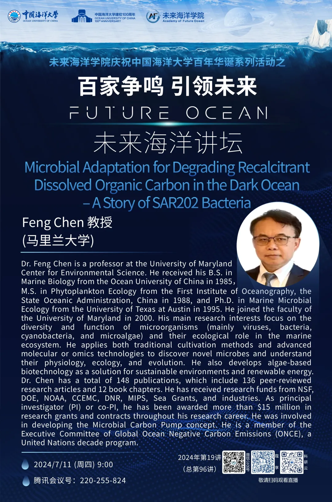 百家争鸣 引领未来 | 未来海洋讲坛第96讲(2024年第19讲) -Feng Chen: Microbial Adaptation for Degrading Recalcitrant Dissolved Organic Carbon in the Dark Ocean – A Story of SAR202 Bacteria