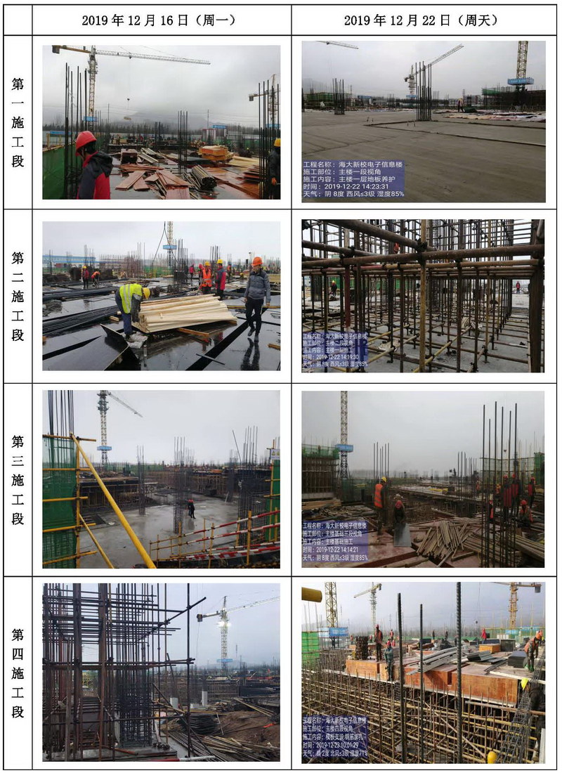 通过对电子信息楼基坑四个施工段施工过程中同一位置一周内的影像资料(周一与周天)进行对比,对施工现场的形象进度进行描述,主要内容如下表所示。