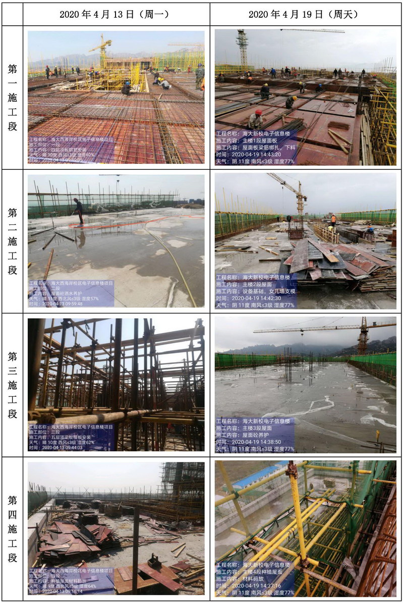 通过对电子信息楼四个施工段施工过程中同一位置近一周的影像资料(周一与周天)进行对比,对施工现场的形象进度进行描述,主要内容如下表所示。
