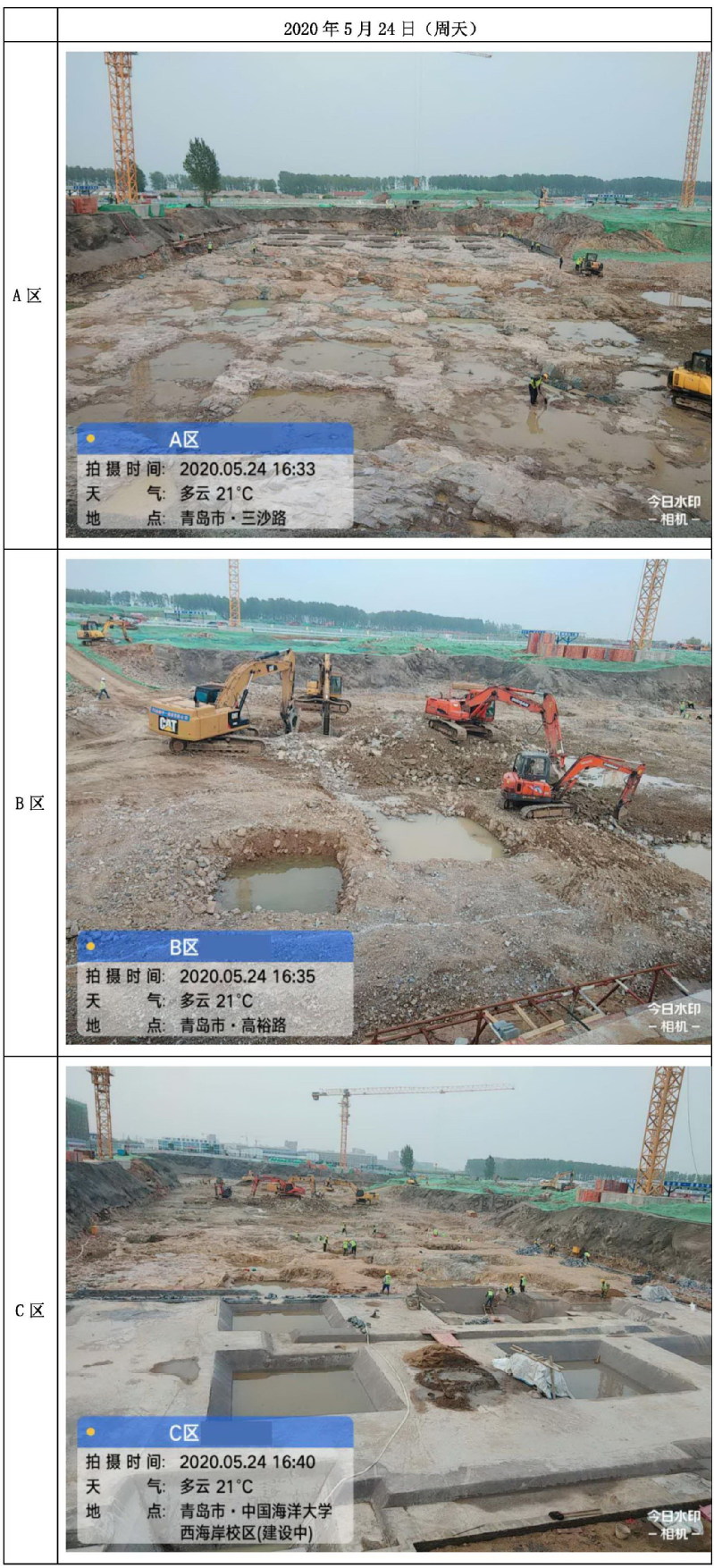 通过对基坑三个区域进行拍摄,展示学习综合体施工现场的形象进度,如下表所示。