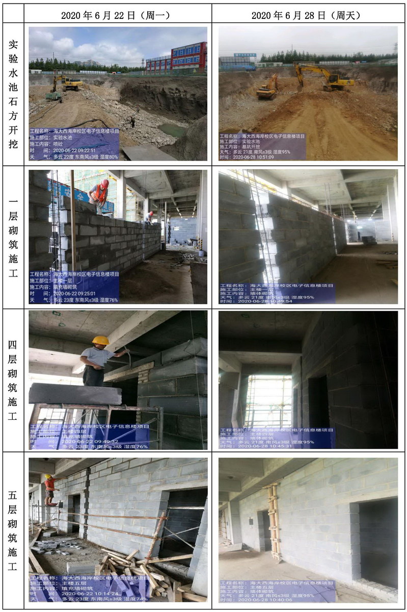 一层砌体墙砌筑施工完成约90%;二层砌体墙砌筑施工完成;三层砌体墙砌筑施工完成;四层砌体墙砌筑施工完成;五层砌体墙砌筑施工完成约80%;屋面设备层砌体墙砌筑施工完成约90%;地下室砌体墙砌筑施工完成;实验水池石方开挖完成约60%;室外水池基坑支护完成约55%。
