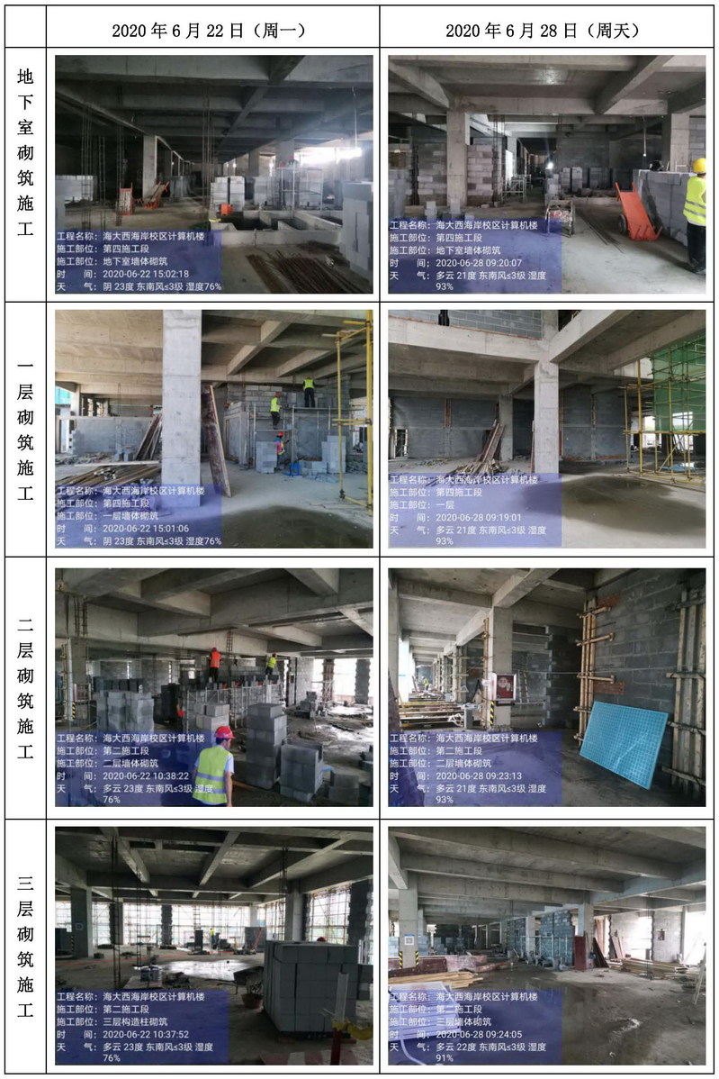 本周地下室墙体砌筑完成约50%;一层墙体砌筑完成;二层墙体砌筑完成约50%;三层墙体砌筑完成约50%;四层构造柱钢筋绑扎完成;五层植筋完成。