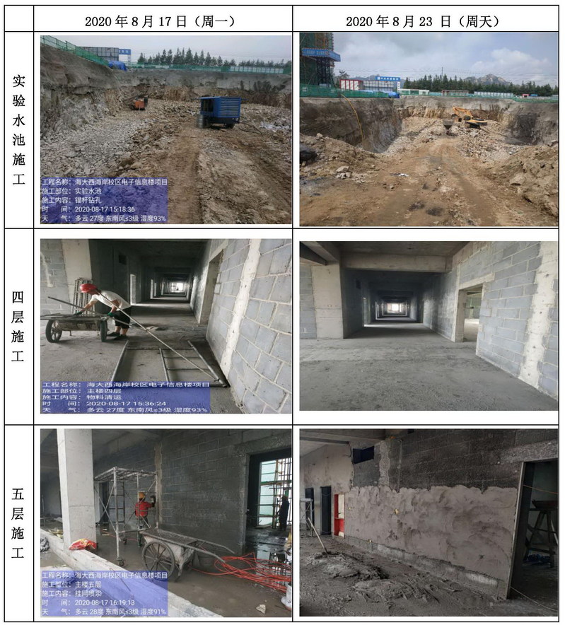 电子信息楼外墙挂网、喷浆完成70%,外墙抹灰完成30%。屋面找坡完成,二区屋面防水完成,三区屋面保温层完成。室外水池石方开挖完成85%,基坑支护完成70%。内墙挂网、喷浆完成50%,五层内墙抹灰完成10%。
