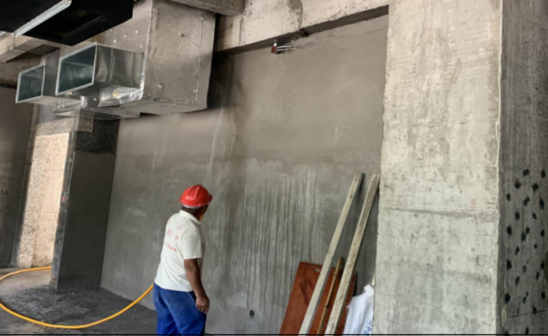 工程楼内墙抹灰养护施工近景