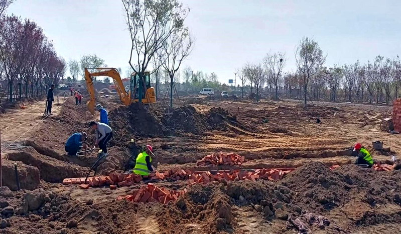 海军路入口广场雨水管线安装完成,南侧园路砂石压实及混凝土垫层浇筑完成,北侧园路砂石压实完成30%;东区南侧水系土方开挖完成70%。