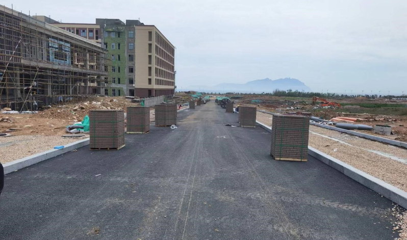 道路沥青下部面层摊铺完成,人行道铺装完成55%,智能交通设施线路铺装完成、基础施工完成,绿化土地整理完成80%。