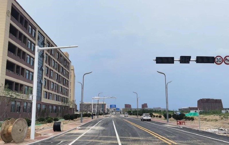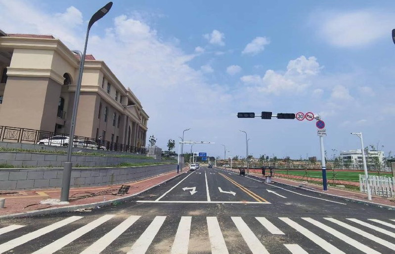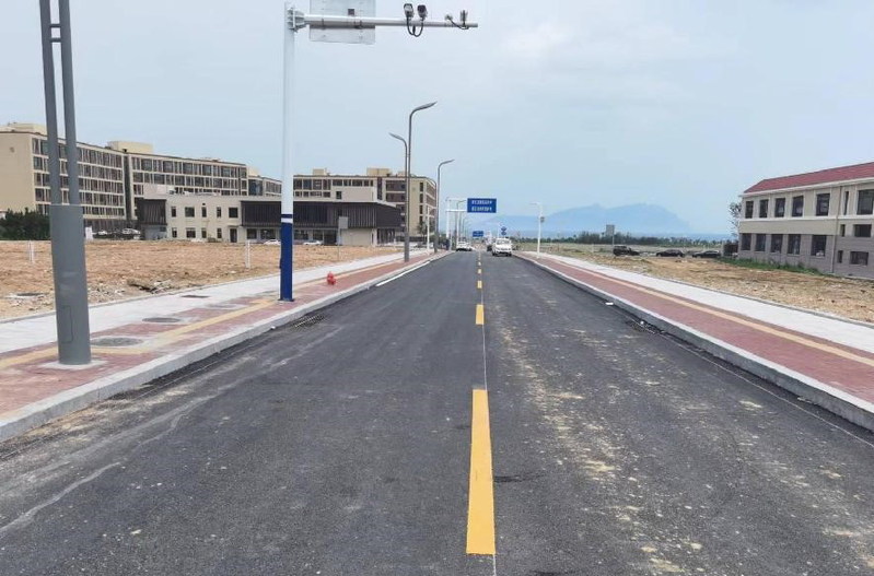 最后一遍沥青罩面铺设完成,正在进行道路划线等收尾工作。
