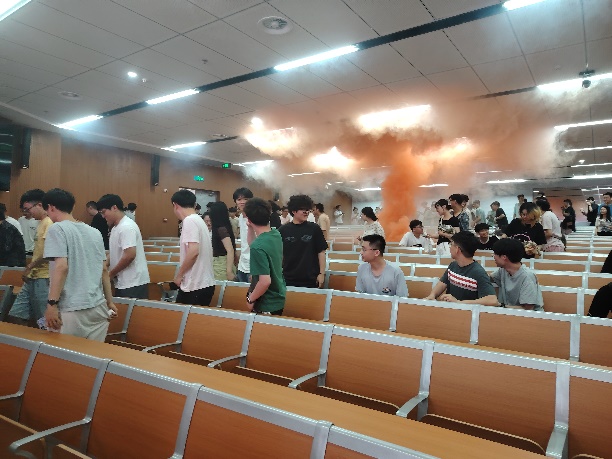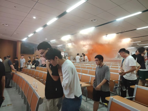 培训结束后,报告厅内模拟了室内火灾现场。随着火灾自动报警系统开始报警,消防控制室值班人员拉响了工程楼负一层的火灾声光警报,在急促的警报声中,报告厅内的师生在烟雾中有序从两扇疏散门撤离到室外中庭,并在现场疏散引导组人员的引导下到工程楼西侧空地集合。