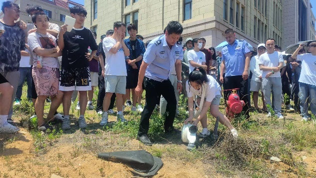 集合完毕后,安保队长张新阳带领微型消防站工作人员为同学们展示了灭火器和消防水带的使用方法。同学们四人一组有序进行了灭火器火盆灭火实操和室外消火栓接消防水带灭火的标准流程。