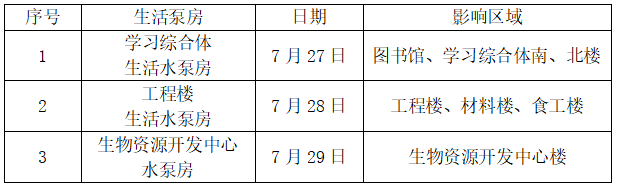 保洁、零星维修、宿管值班、绿化等正常服务。生活水泵房水箱清洗,部分楼宇需停水,计划如下: